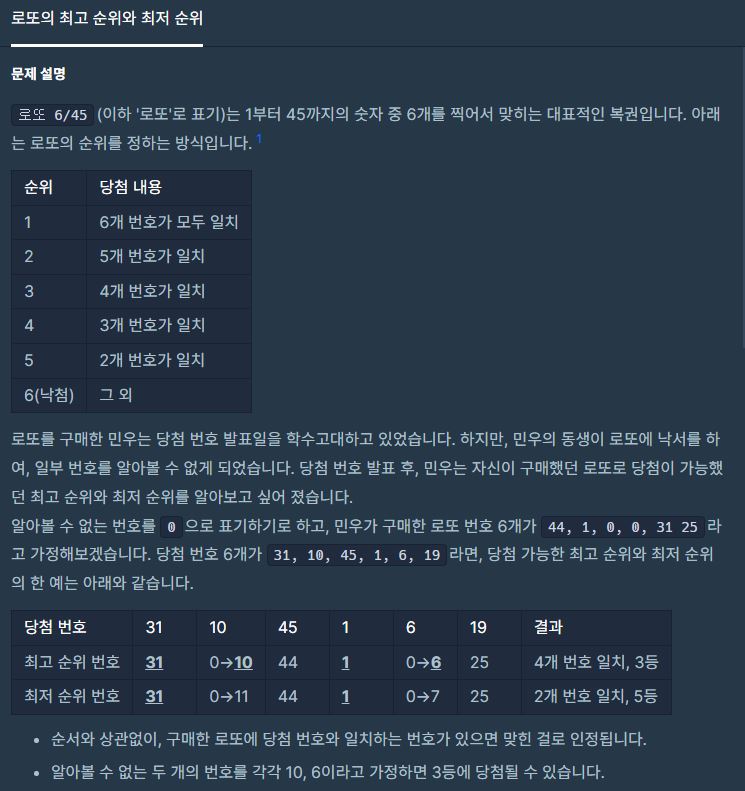 /* 숫자 1개만 맞을 경우(계산결과 6)와 하나도 맞지 않을 경우(계산결과 7) 둘다 6등(낙첨) */